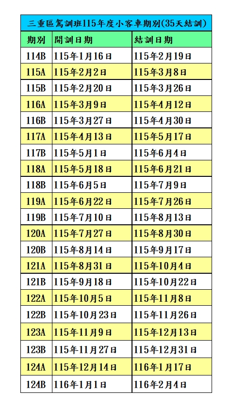小汽車考駕照 三重區駕訓班年度訓練計畫表 ( 35 天結訓)